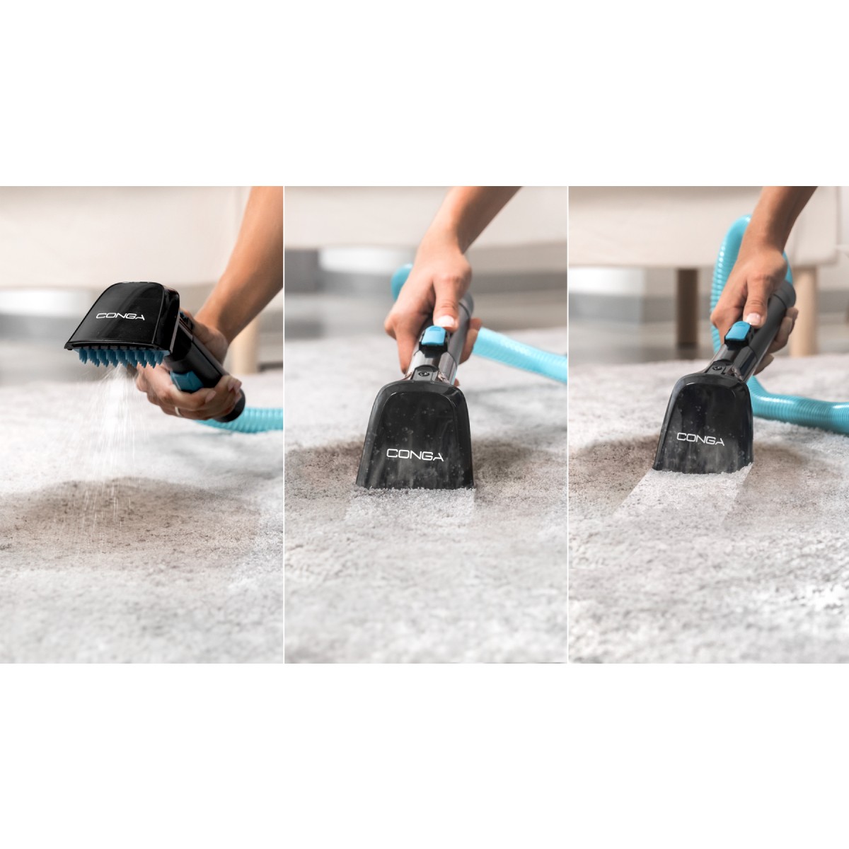 The Conga 4000 Carpet & Spot Clean XL is designed to make your cleaning routine easier. Its water spraying system on the head allows you to easily adjust the water flow, adapting the amount to the type of surface. This way, you can efficiently clean upholstery, carpets, and mattresses, removing even the most embedded dirt.