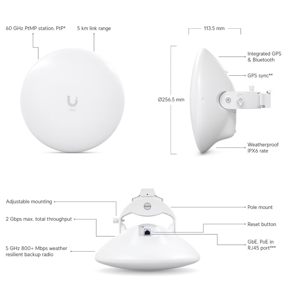 A antena funciona em modo estação PtMP ou ponto-a-ponto e vem equipada com funcionalidades como Wave AI, ping watchdog, alinhamento de antena e muito mais. Usa o sistema UISP para uma gestão simples e eficaz.