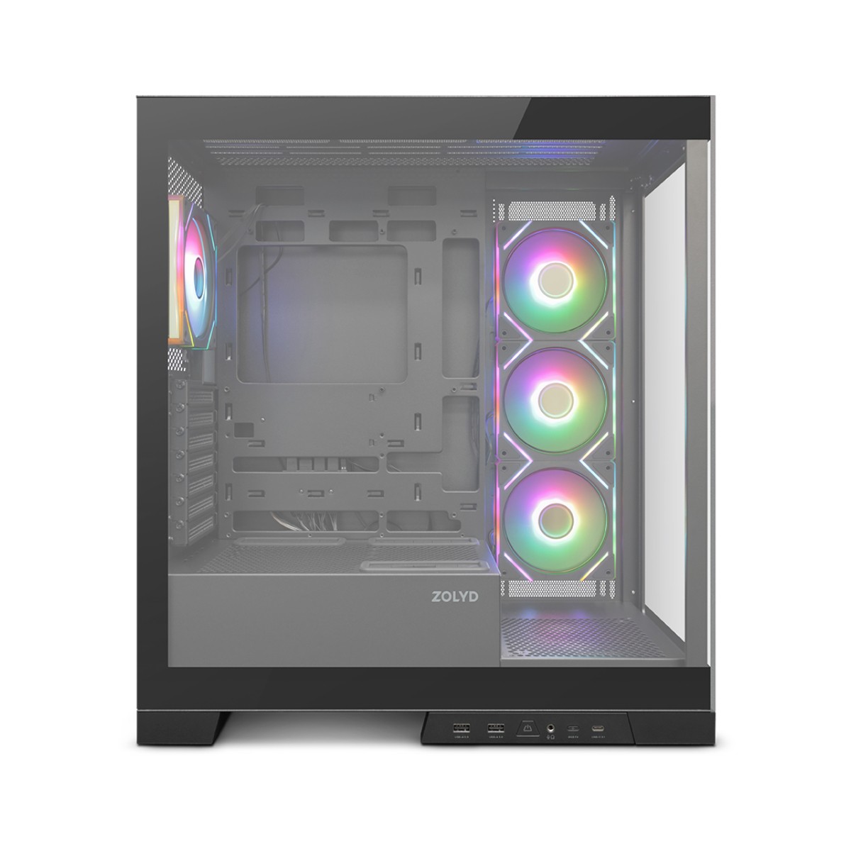 A Zolyd Vexora combina desempenho e estética de forma harmoniosa. Os seus painéis elegantes em vidro temperado mostram o teu sistema, enquanto a iluminação das ventoinhas ARGB Infinity Mirror cria um efeito visual impressionante. Compatível com motherboards ATX, Micro-ATX e Mini-ITX, oferece espaço ideal para componentes de alto desempenho, opções flexíveis de arrefecimento e conectividade moderna, sendo a base perfeita para uma build refinada e personalizável.