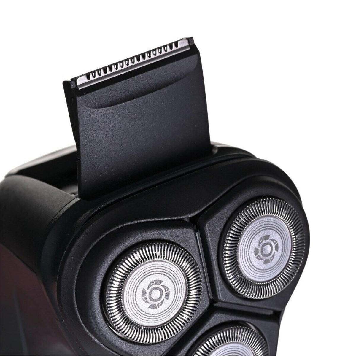 A cabeça da máquina de barbear abre-se com o toque de um botão para enxaguar em água corrente.