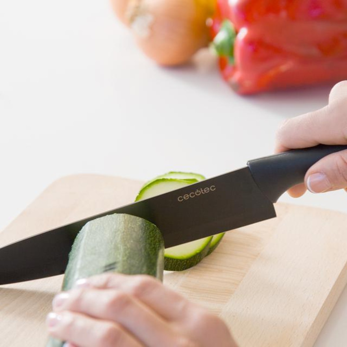 O revestimento cerâmico facilita o corte e evita que os alimentos se agarrem à lâmina. A combinação entre aço afiado e cerâmica garante cortes mais suaves, rápidos e eficazes.
