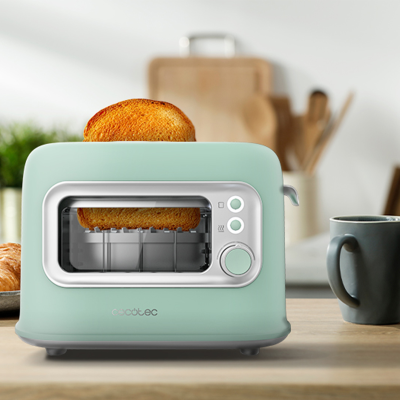 A Torradeira Cecotec RetroVision combina um design vintage encantador com funcionalidades modernas, tornando cada pequeno-almoço mais prático e cheio de estilo. Com acabamento em verde claro e detalhes em aço inoxidável, adapta-se facilmente a qualquer cozinha e acrescenta um apontamento decorativo distinto.